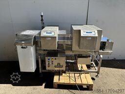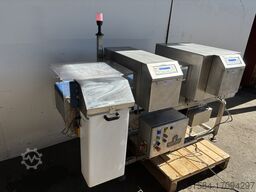 Nierdzewny wykrywacz metali, podwójna głowica, żelazo w folii, wymiary taśmy 2000 mm x 280 mm, otwór 340 mm x 120 mm, odrzucanie ramienia pchającego, 3Ph